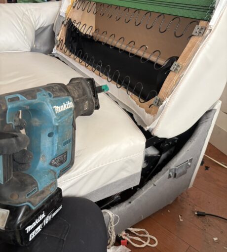 【巨大ソファ、当時ベランダから搬入しましたが・・・】江戸川区にて2階から出ない大型ソファを真っ二つ即日回収処分!!
