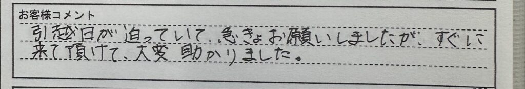 【引越し日が迫っていて、急きょお願いしましたが、すぐに来て頂けて、大変助かりました。】