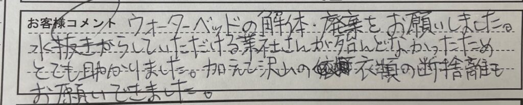 🛏️ ウオーターベッド解体・回収処分についてお客様より感謝のお言葉を頂きました。🛏️