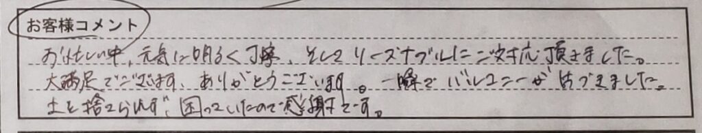 「お忙しい中、元気に明るく丁寧、そしてリーズナブルにご対応頂きました。大満足でございます。一瞬でバルコニーが片づきました。土を捨てられず困っていたので感謝です。」